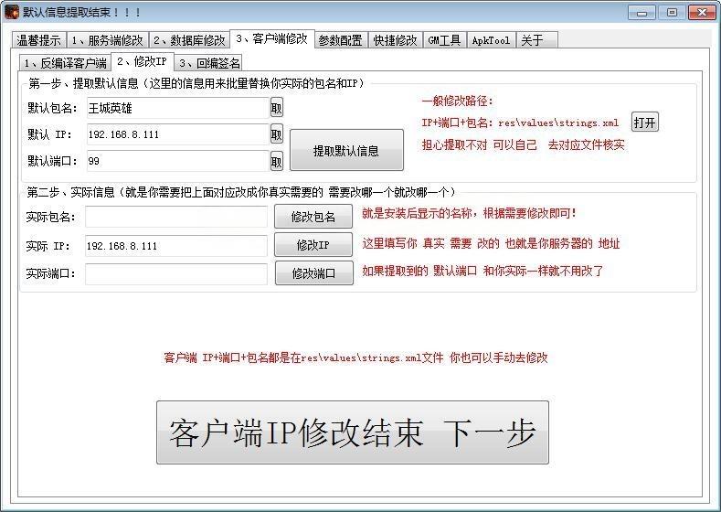 确定好真实 IP 后点一下“修改包名”或“修改 IP”,再执行“客户端 IP 修改结束 下一步”,就能得到新的客户端包内容。我自己测试过几次,只要原始包没做特殊加固,都能正常改。