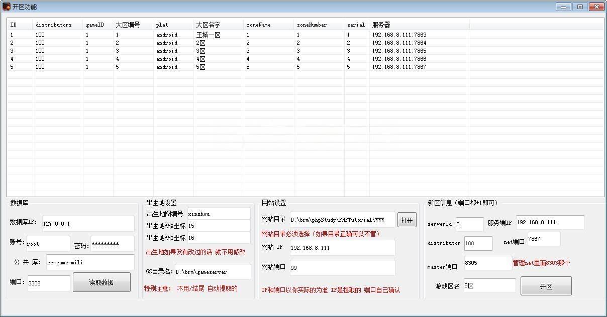 点击读取数据后可以直接同步当前区服列表,然后一键将新区写入数据库。实测一套老版本项目,用它开区比手工写 SQL 快太多。