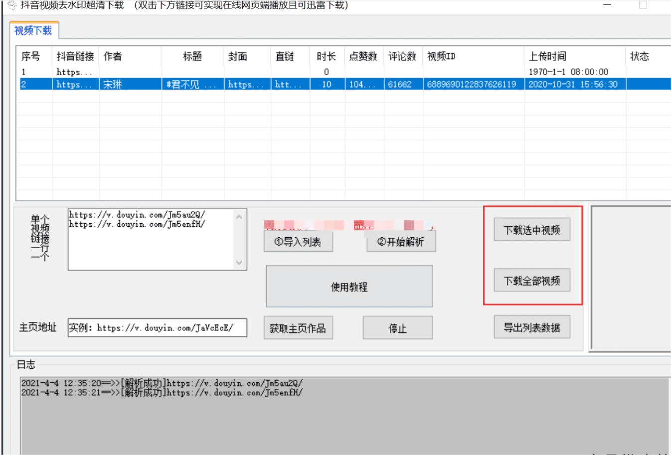 将复制的视频链接添加到下载列表中,单击“导入列表”按钮。导入后,所有链接将显示在左上角的“抖音列表”中,便于后续操作。