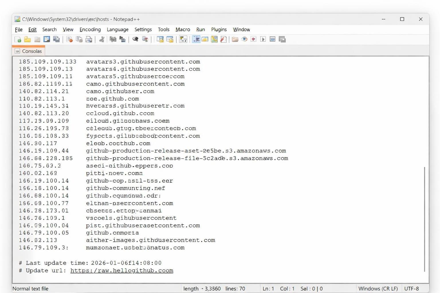 从截图可以看到,hosts 文件已经被自动写入了一批 GitHub 相关域名映射。脚本执行时窗口会闪一下,很快就结束,实际上已经完成了修改。