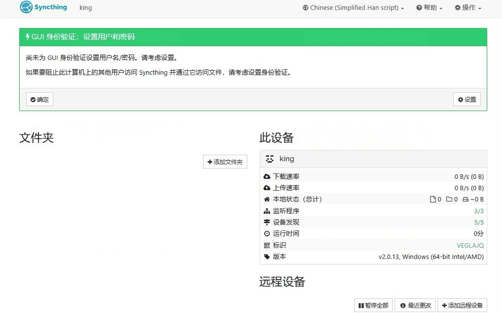 软件界面简洁直观,设备状态、同步进度、文件夹配置一目了然,首次运行即可快速完成基础配置。支持自由添加本地目录作为同步节点,也可以通过设备 ID 建立远程设备连接,适合个人办公资料、项目文件、开发资源等多场景使用。