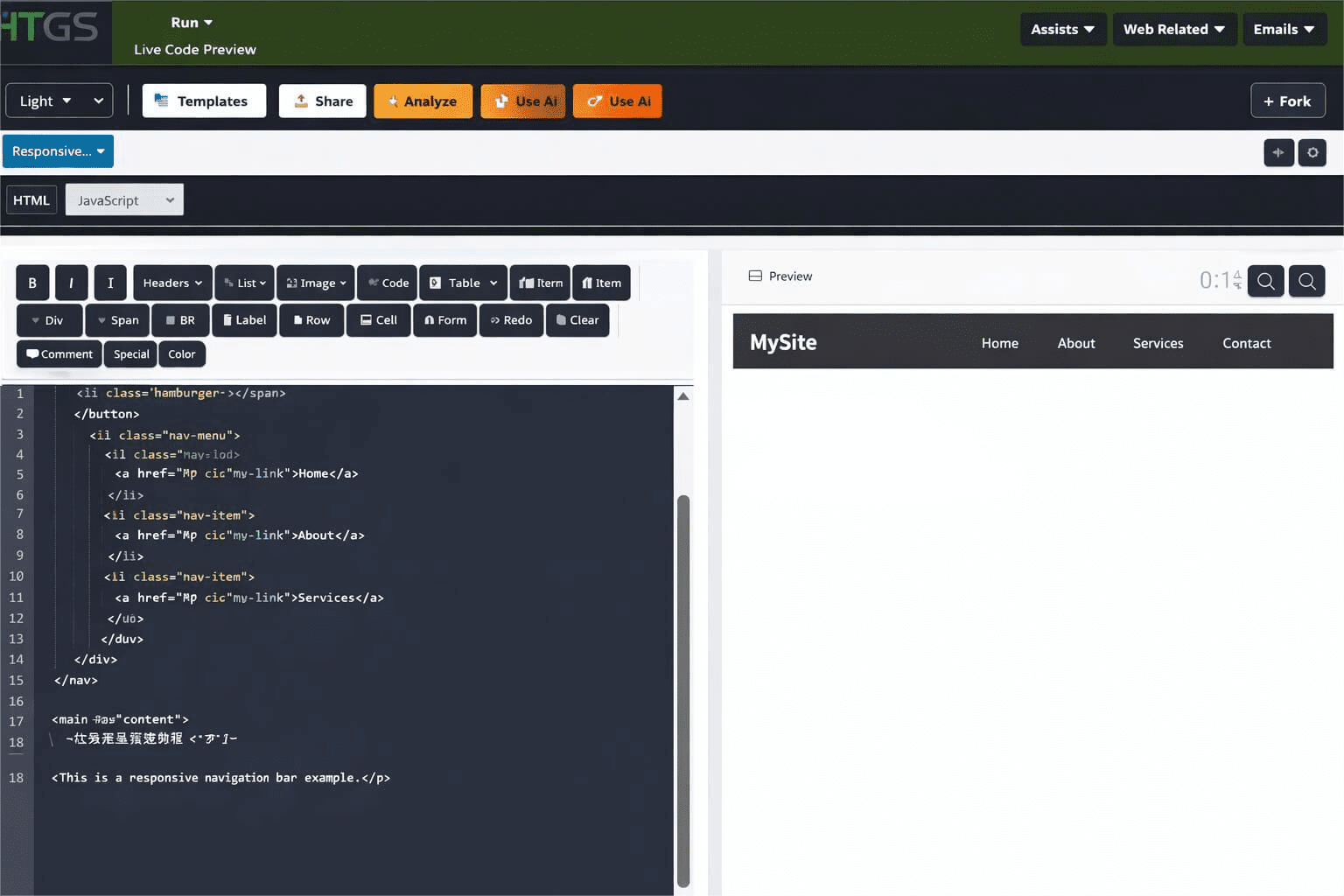 htgs 在线编辑器主界面,左侧代码区,右侧实时预览效果