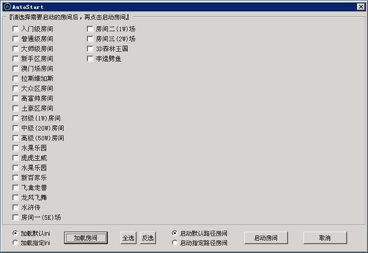 功能上比较直接:支持勾选单个房间,也可以全选批量启动;底部有“加载默认INI”“全选”“反选”等按钮,启动前还可以选择是否走默认路径。