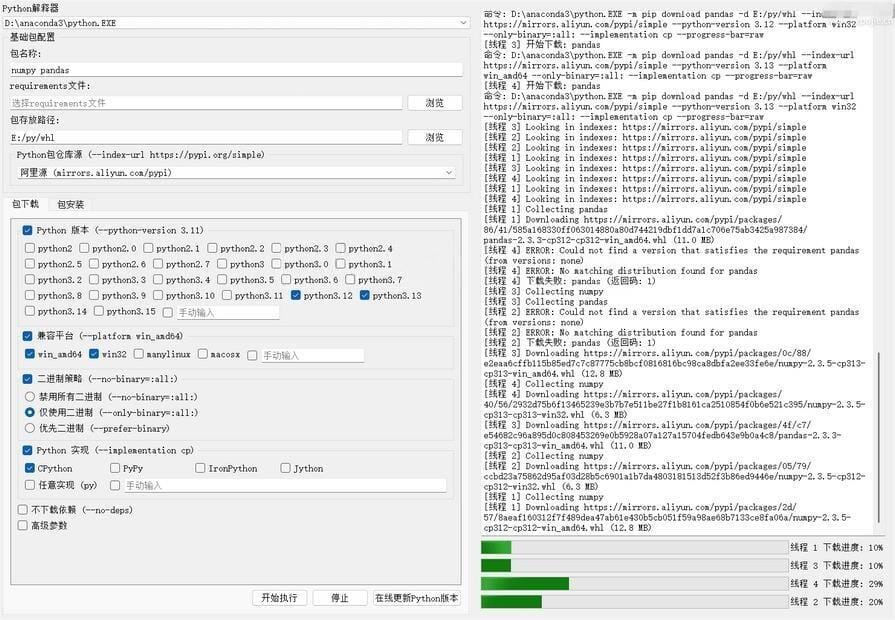 - 选好目标 Python 版本、系统平台(win_amd64、win32 等)、是否仅下载二进制 whl、是否排除源码包等参数;