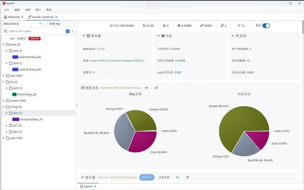 支持浏览库结构、查看 key 详情、图表展示键类型分布、连接信息监控等核心功能。